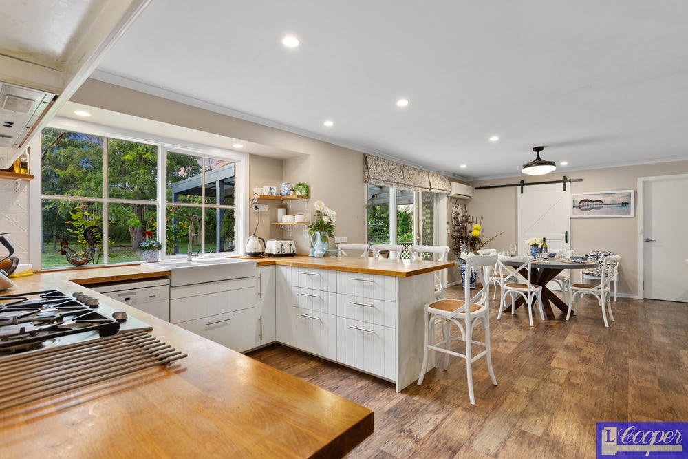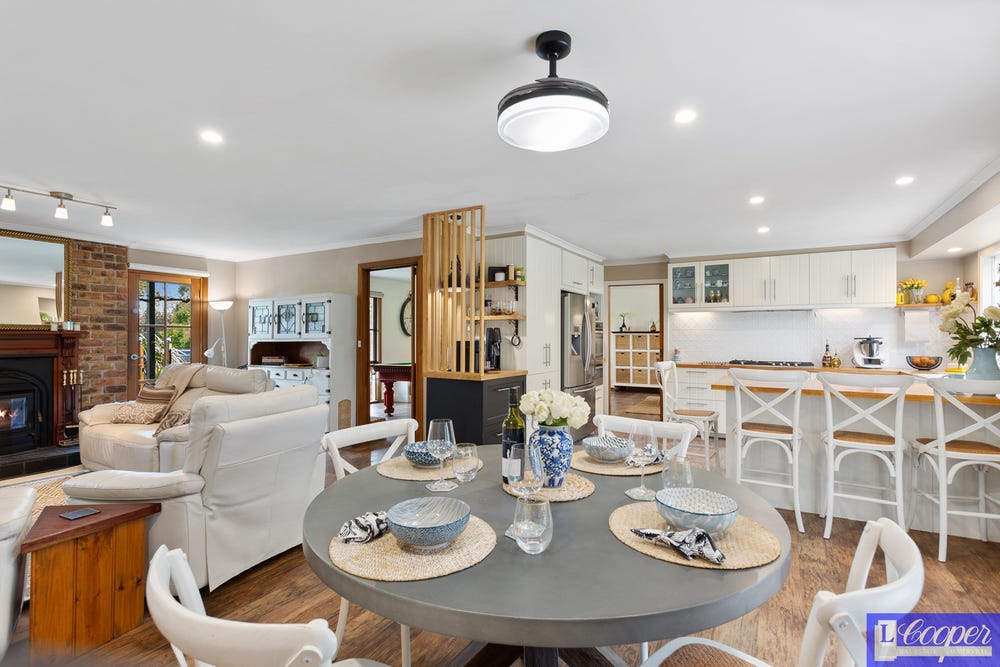 The meals area is located right next to the kitchen for informal gatherings. The loungeroom includes a Coonarra wood burner with a beautiful timber surround, reverse cycle air conditioner and ceiling fans.